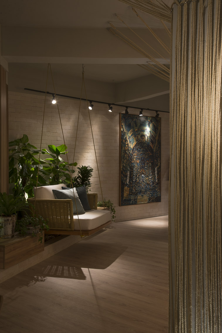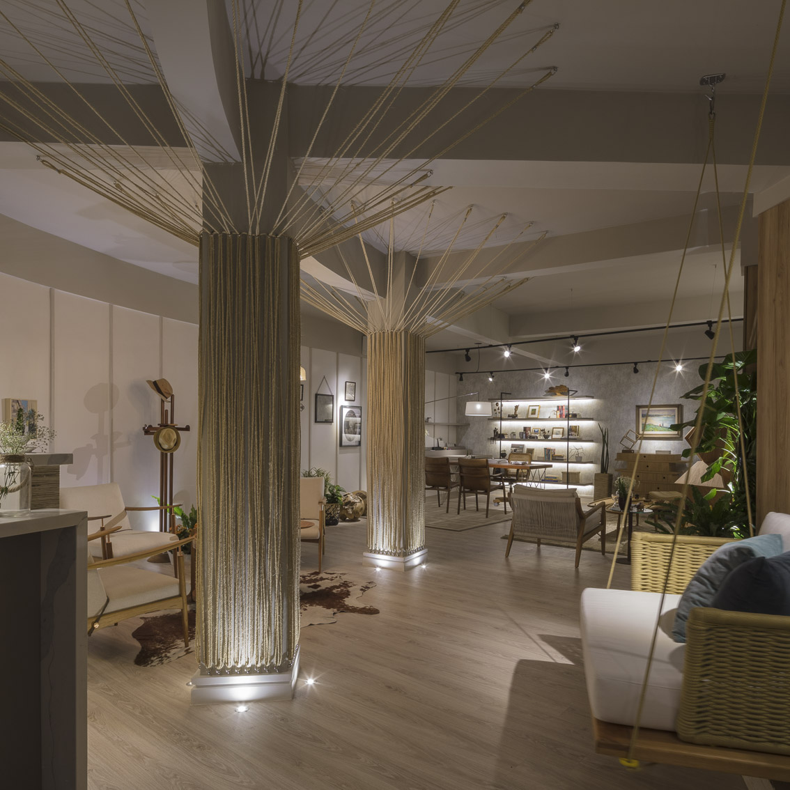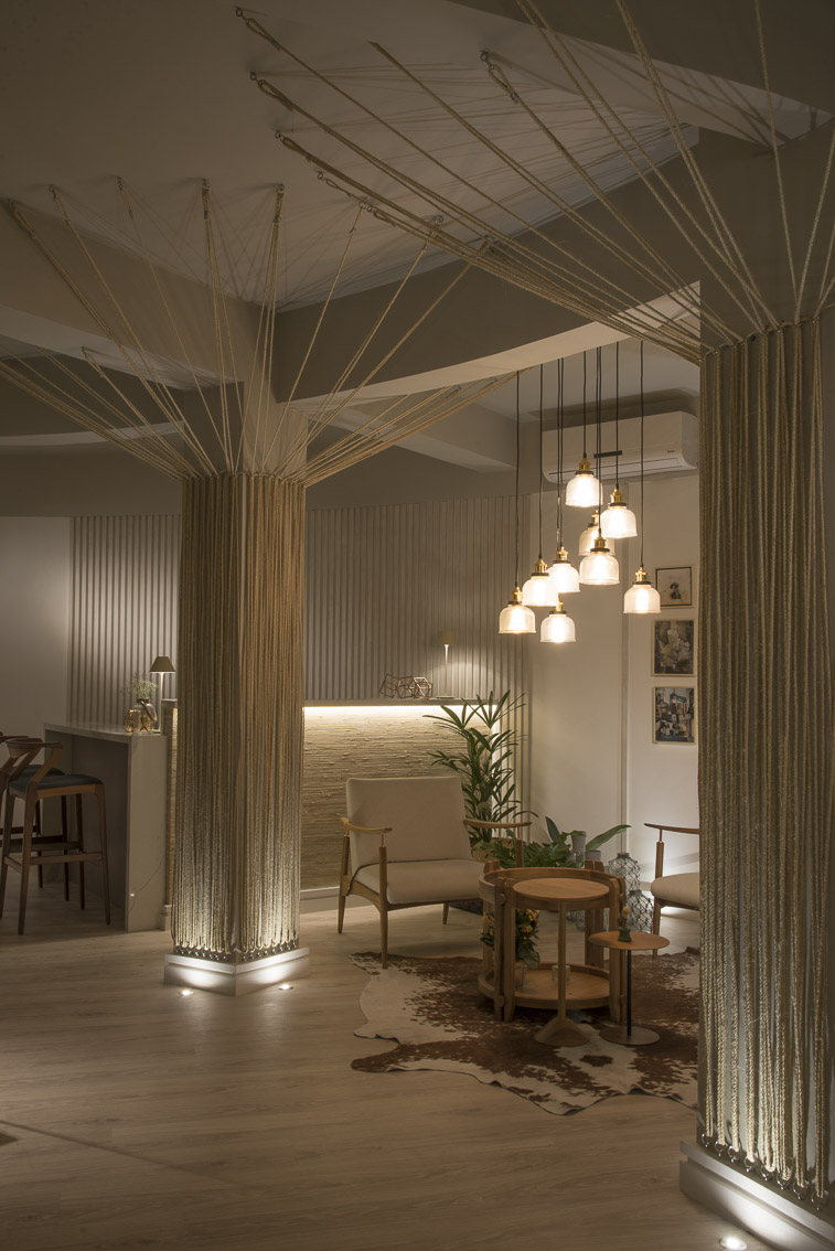 O projeto foi inspirado em uma praça particular. Cordas de sisal foram presas em colunas existentes formando árvores conceituais que sombreiam o pequeno espaço de café que promove a conversa e o encontro. Um jardim interno leva o verde para dentro e vasos de plantas permeiam todo o espaço. Um balanço solitário chama à reflexão. O uso de elementos naturais como tijolo, madeira, corda, palha e couro remetem à natureza.